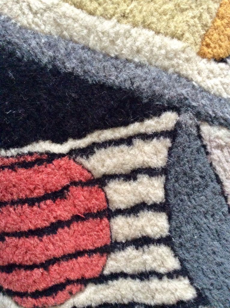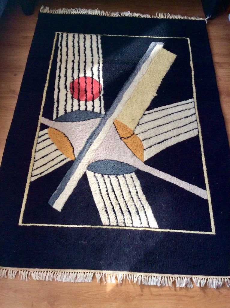 Preciosa alfombra danesa de lana hecha a mano con diseño abstracto de un artista escandinavo cuyo nombre no recuerdo. Es de pelo medio/largo. Vintage, de los años 70/80.