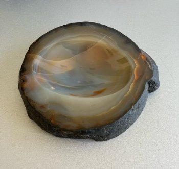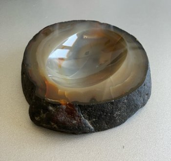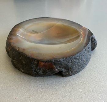Cenicero de ágata jaspeada tallado a partir de una una geoda natural, una pieza decorativa hecha a partir de geoda de ágata natural, probablemente de origen brasileño.