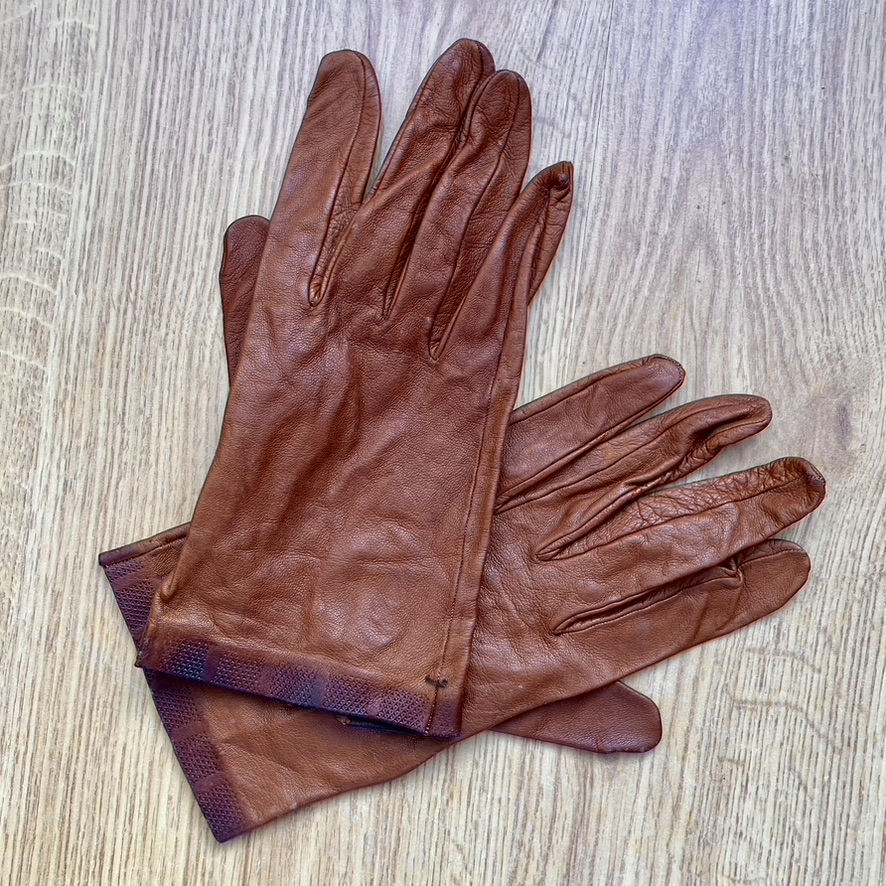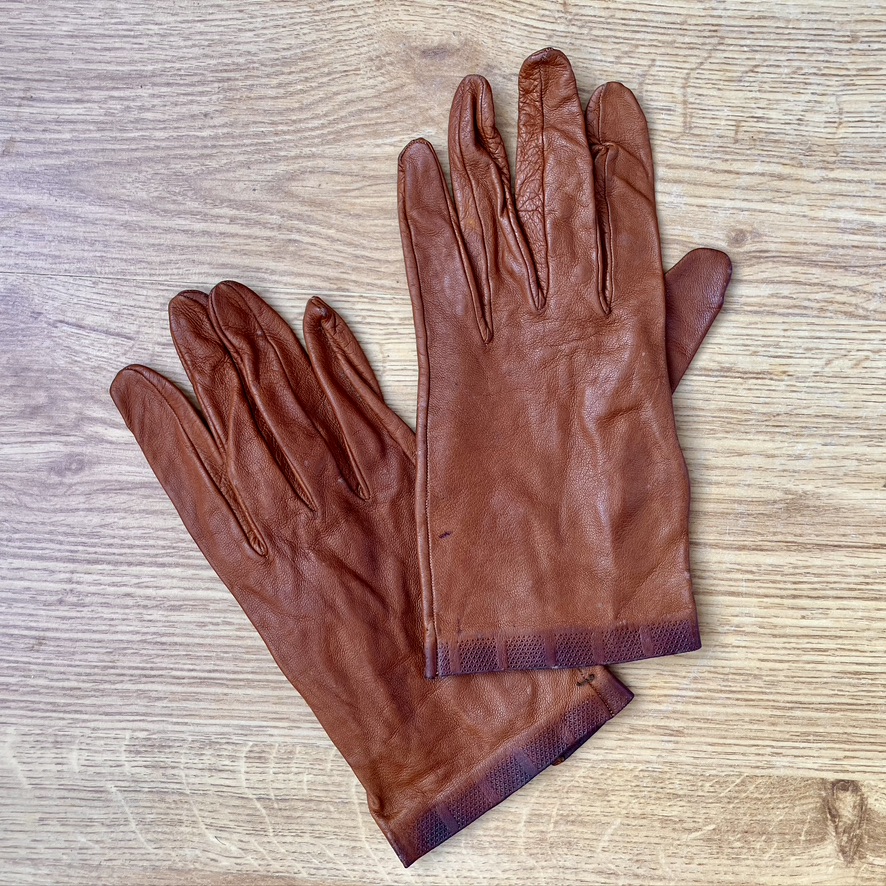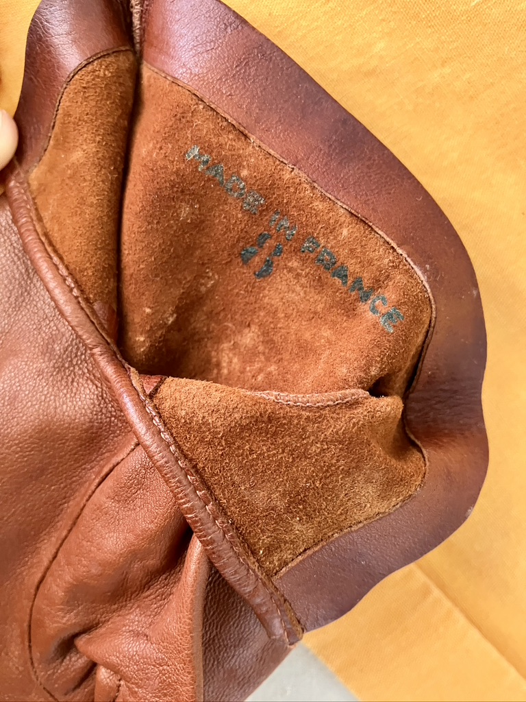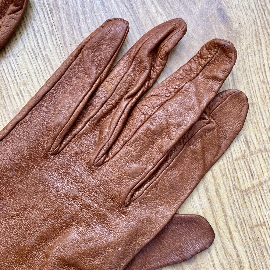 Guantes de piel vintage para mujer color avellana con la inscripción “Made in France” en el interior. Piel fina, muy suaves y cómodos.