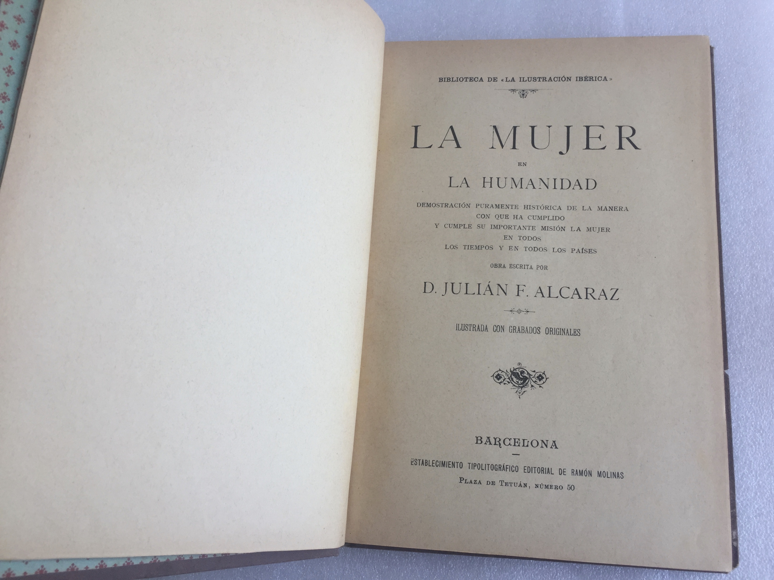 Esta joya antigua es el libro “La Mujer en la Humanidad”, escrito por Julián F. Alcaraz. Se trata de una obra histórica publicada originalmente a finales del siglo XIX (hacia 1880) o principios del XX por la editorial Ramón Molinas en Barcelona.