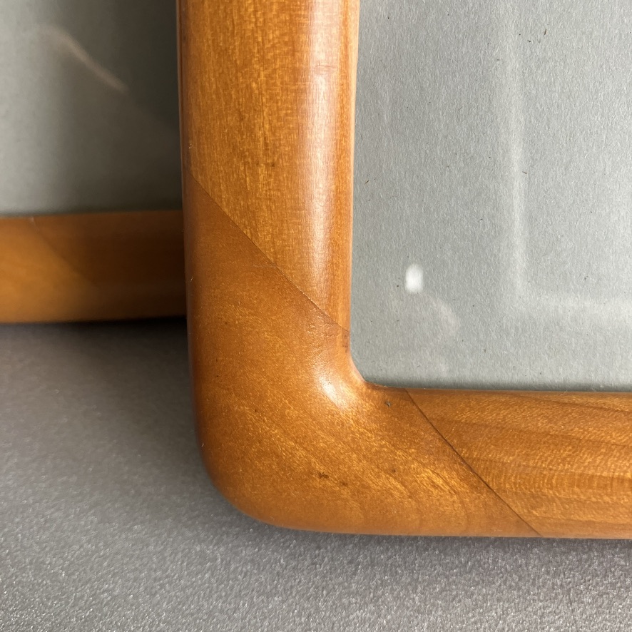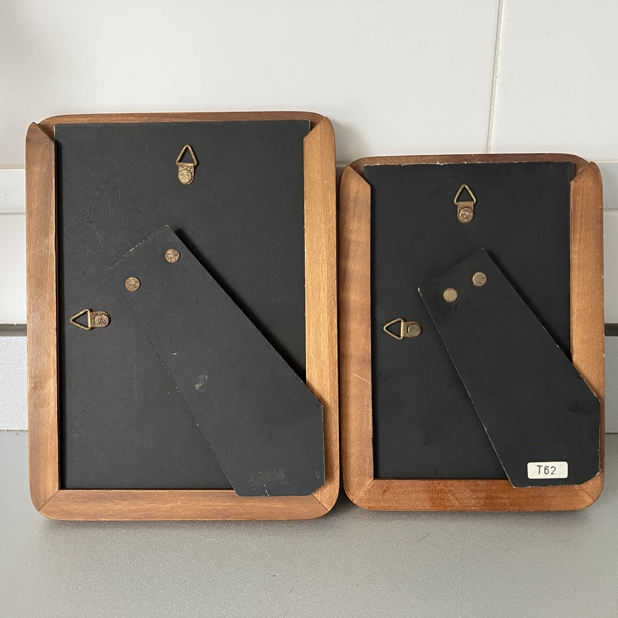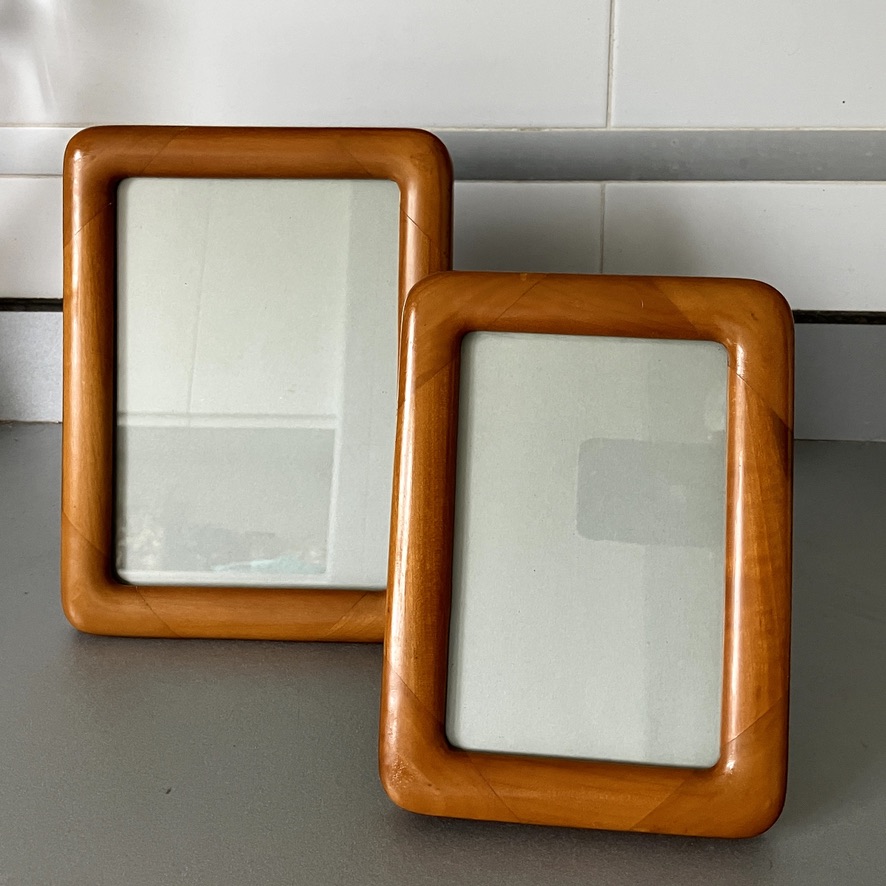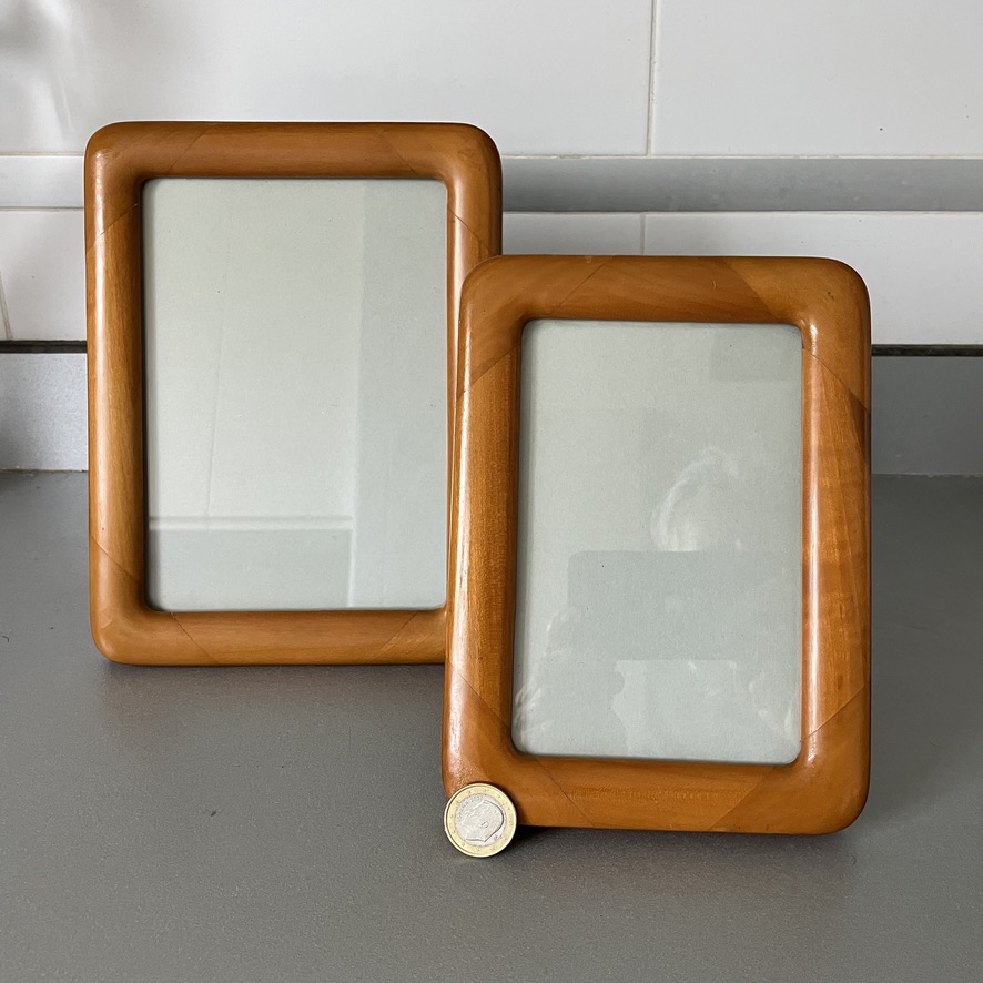 Pareja de marcos para fotos en madera noble con bordes redondeados, estilo vintage, con caballete de dos posiciones, parte trasera de mesa horizontal y vertical, gancho para colgar en la pared. Década de 1980.