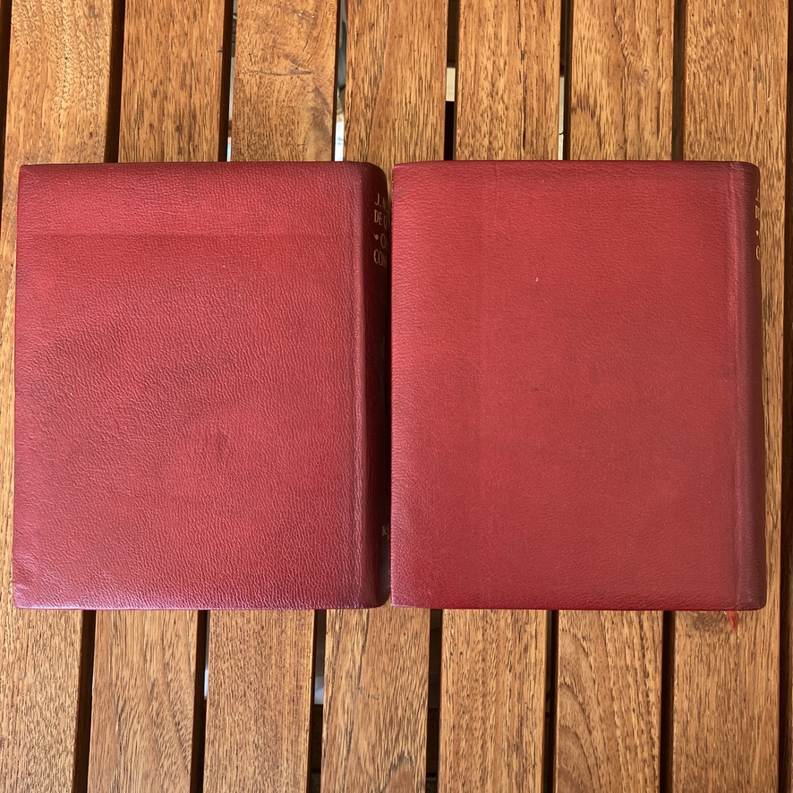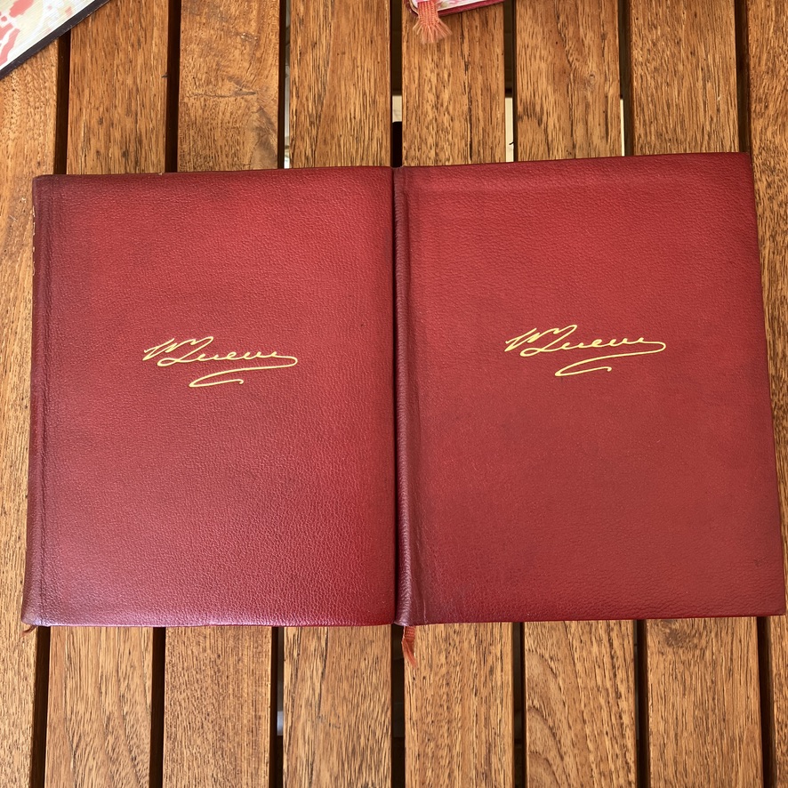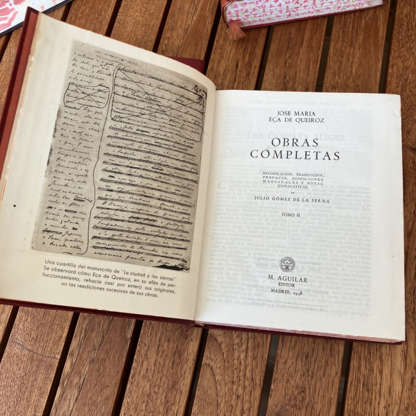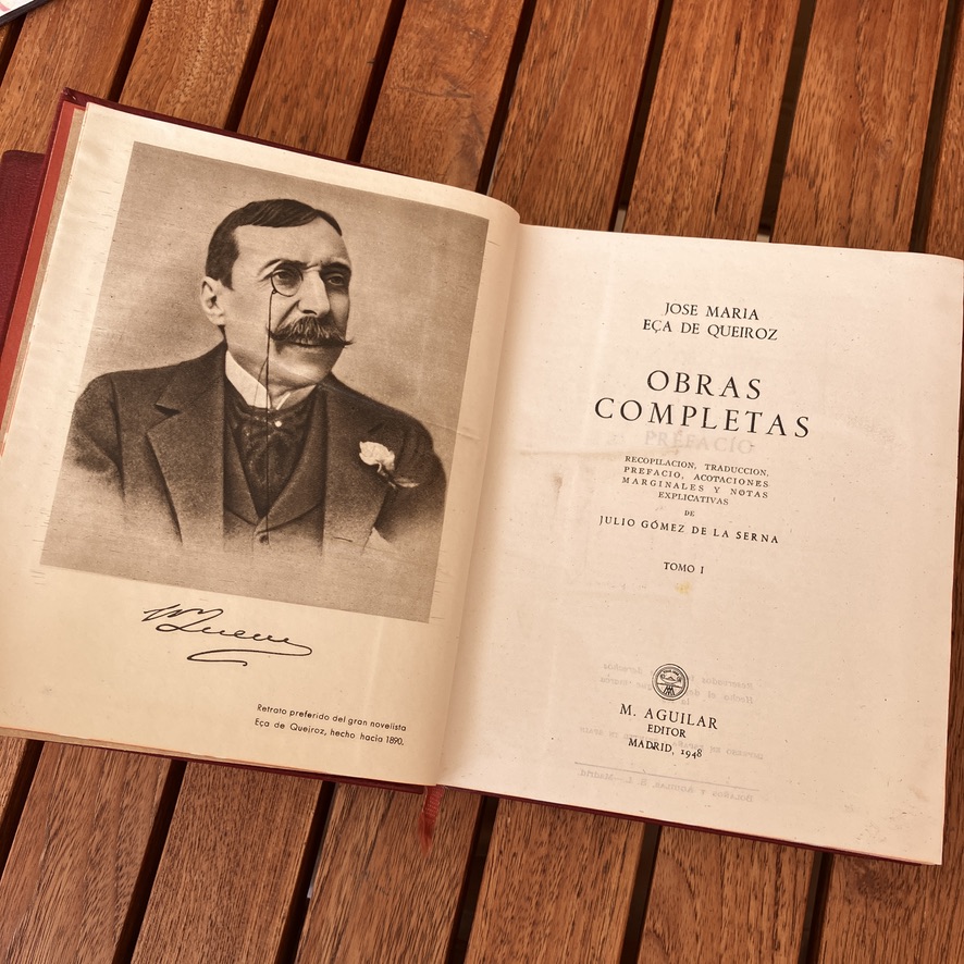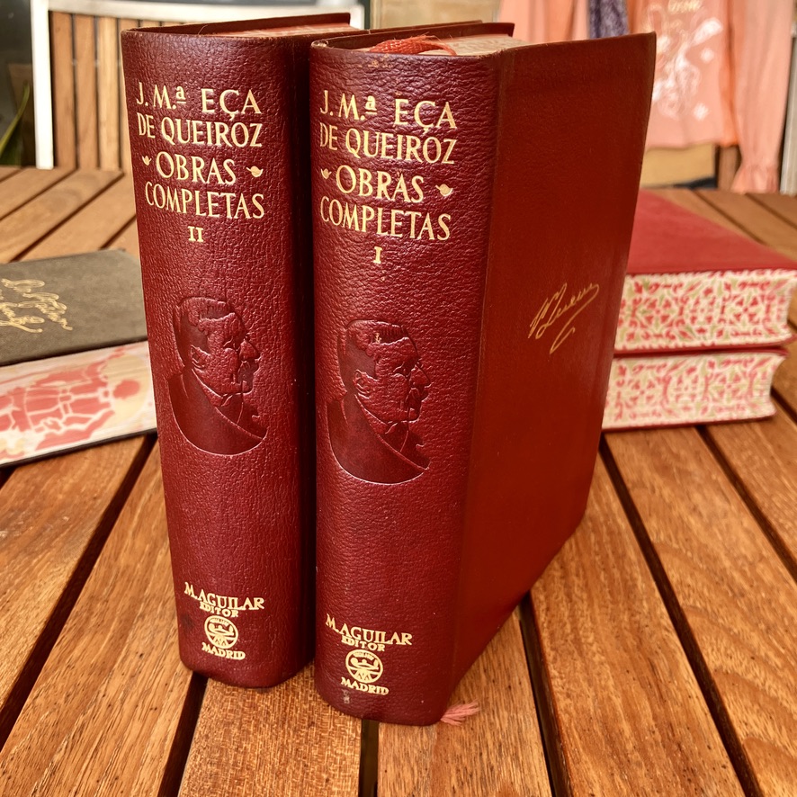 Edición en dos tomos de las Obras Completas de Eça de Queiroz, publicados por la Editorial Aguilar en Madrid, 1948. Esta edición pertenece a la colección Obras Eternas, reconocida por su encuadernación en plena piel con el busto del autor grabado en seco en el lomo y la impresión en papel biblia.
