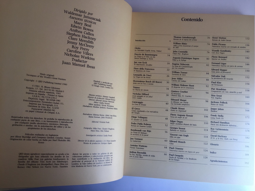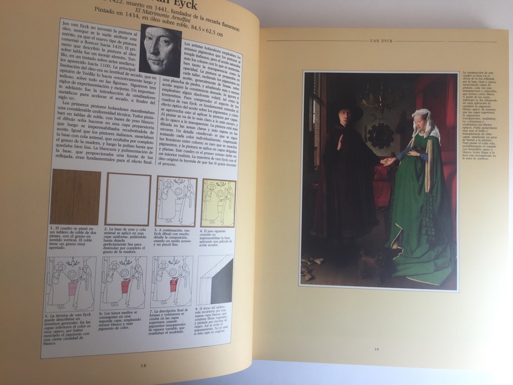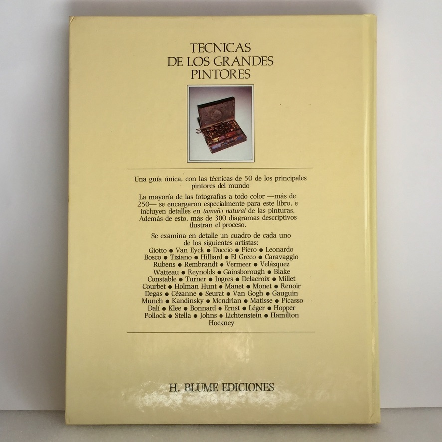 Una gran publicación que explica las técnicas pictóricas empleadas por 50 de los grandes pintores del mundo. Con más de 50 fotograrías a todo color encargadas especialmente para esta obra. Con detalles a tamaño natural de las pinturas. Se incluyen también diagramas descriptivos que ilustran el proceso. Además se examinan con detalle artistas como Van Eyck, Giotto, El Greco y muchos más.